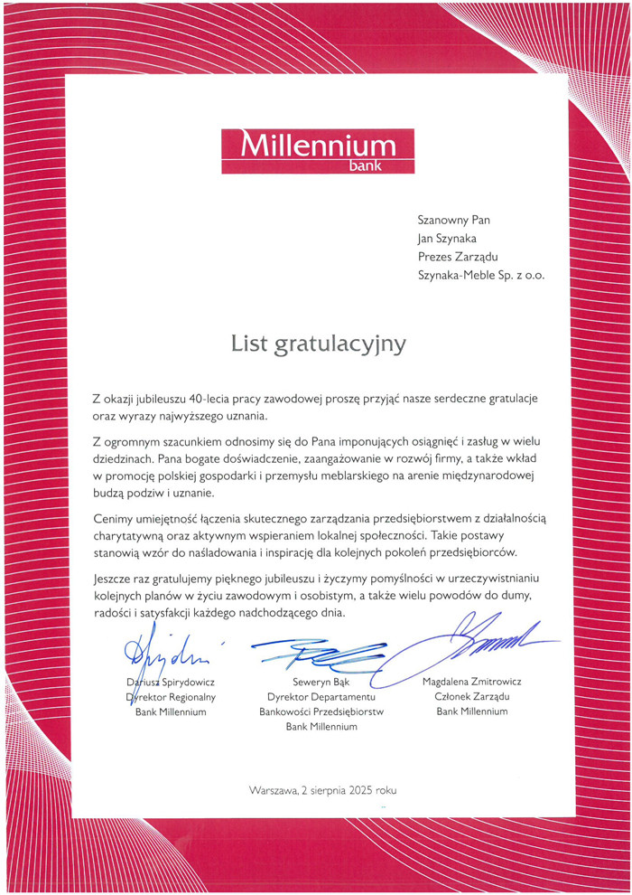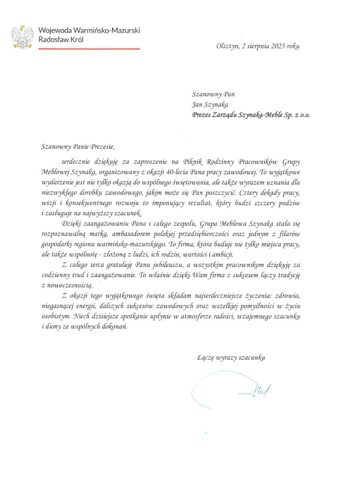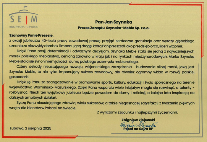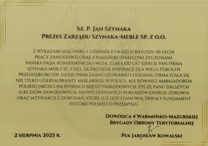 Wydarzenie zgromadziło setki gości: partnerów strategicznych, przedstawicieli władz państwowych i samorządowych, świata nauki, biznesu, duchowieństwa oraz reprezentantów najważniejszych organizacji branżowych z całego świata. Wśród obecnych były również osoby prywatne, przyjaciele oraz najbliższa rodzina, którzy towarzyszyli Prezesowi w jego wieloletniej drodze zawodowej. Obecność tak licznie przybyłych gości była wyrazem głębokiego uznania dla wizji, determinacji i przywództwa, jakie Jan Szynaka wnosi do polskiej gospodarki od czterech dekad. Ten wyjątkowy jubileusz stał się nie tylko symbolicznym podsumowaniem 40-letniej pracy, ale również świętem wartości, relacji i wspólnoty – fundamentów, na których zbudowana została pozycja i potęga Grupy Meblowej Szynaka.