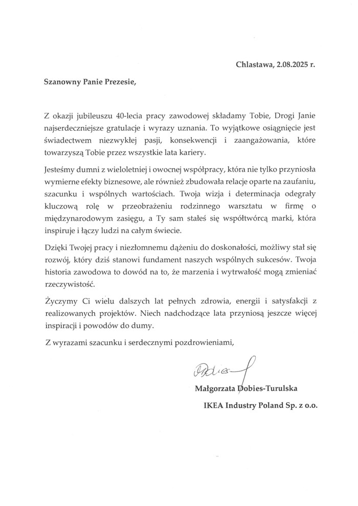 – To dla mnie niezwykle wzruszający moment. Patrząc na minione cztery dekady, widzę nie tylko rozwój rodzinnej firmy, ale przede wszystkim ludzi – współpracowników, partnerów, przyjaciół. To dzięki Wam wszystkim ta historia jest możliwa. Dziękuję za zaufanie, wspólną drogę i to, że razem tworzymy coś większego niż tylko firmę – tworzymy trwałe wartości – mówił ze sceny Prezes Jan Szynaka. Kiedy 40 lat temu rozpoczynałem swoją zawodową drogę, miałem marzenia, które dla wielu wydawały się nierealne. Ale wierzyłem, że poprzez pracę, szacunek i odpowiedzialność można zbudować coś trwałego – coś, co będzie służyć innym, dawać miejsca pracy i poczucie stabilizacji. Dziś wiem, że to była właściwa droga. Szynaka Meble to nie tylko marka. To rodzina ta najbliższa, która zawsze jest przy mnie i ta pracownicza – tworzona przez ludzi z pasją, lojalnością i wiarą w przyszłość. To partnerstwa, które przetrwały próbę czasu, to decyzje podejmowane w zgodzie z wartościami, to rozwój, który nie zapomina o człowieku. Jestem dumny, że dziś jesteśmy obecni na tak wielu rynkach świata, ale jeszcze bardziej jestem dumny z tego, że w sercu tej firmy wciąż jest człowiek. Dziękuję każdemu z Was, że jesteście częścią tej historii – historii, która się nie kończy. Przed nami kolejne rozdziały. Z takimi ludźmi jak Wy, z takimi wartościami – możemy patrzeć w przyszłość z odwagą i spokojem – dodał Prezes Jan Szynaka.