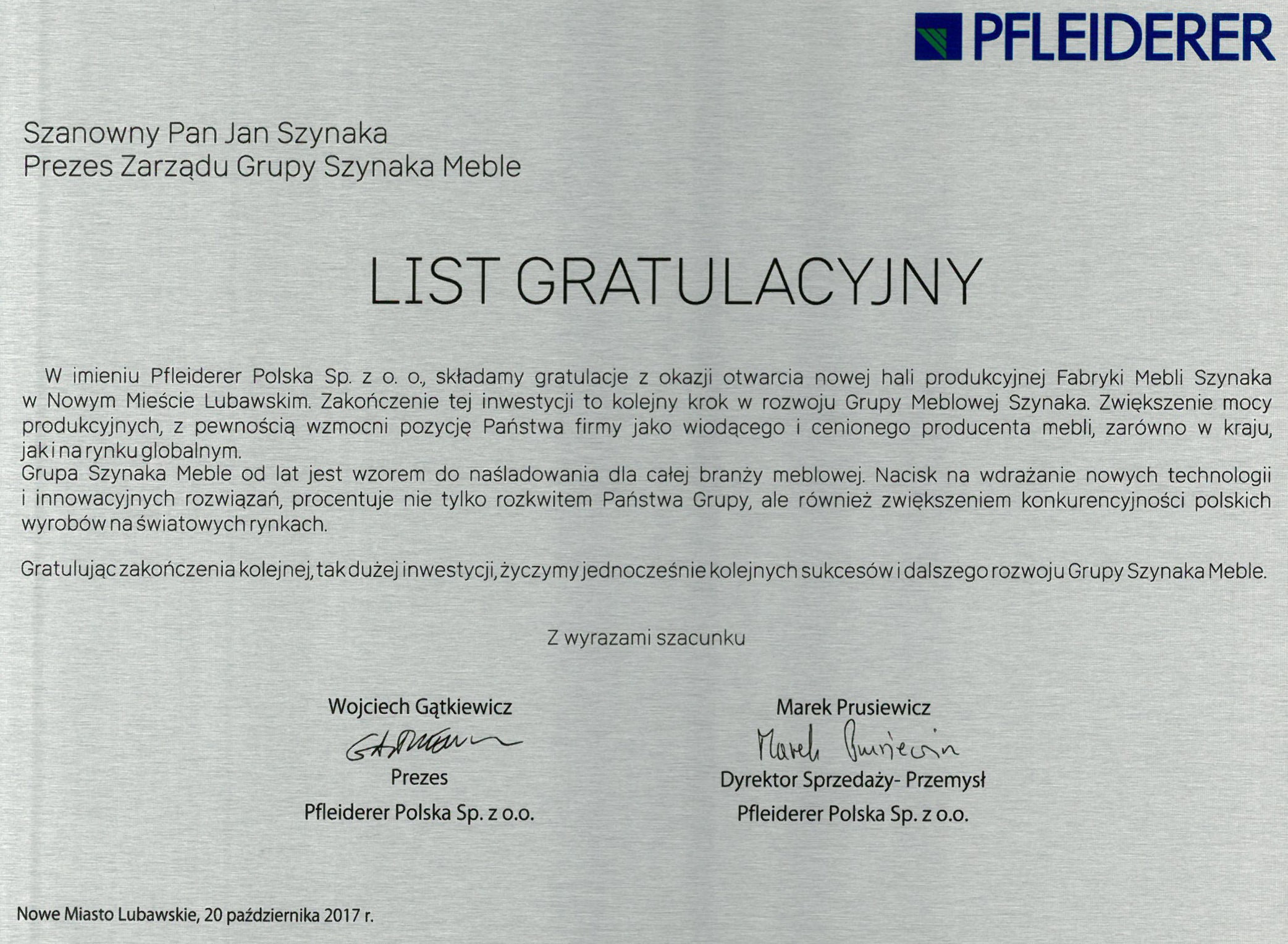 — Bardzo serdecznie gratuluję — zakończył wojewoda. — Nowe Miasto Lubawskie staje się miejscem, gdzie lokujemy, nie tylko swoje inwestycje, wartości i pieniądze, ale również swoje życie i serce. Łączymy się z tym miastem i jego mieszkańcami. Właśnie tu będzie zatrudniona największa grupa naszych pracowników. - We wszystkich zakładach będących częścią grupy nieustannie czynione są przedsięwzięcia mające na celu usprawnienie codziennej pracy. Działania te nie tylko pozwalają zwiększać zyski firmy i zatrudnienie, ale przede wszystkim poprawiają komfort pracy i dają wiele możliwości rozwoju zawodowego osób zatrudnionych w naszych zakładach –dodał na zakończenie Prezes Jan Szynaka.