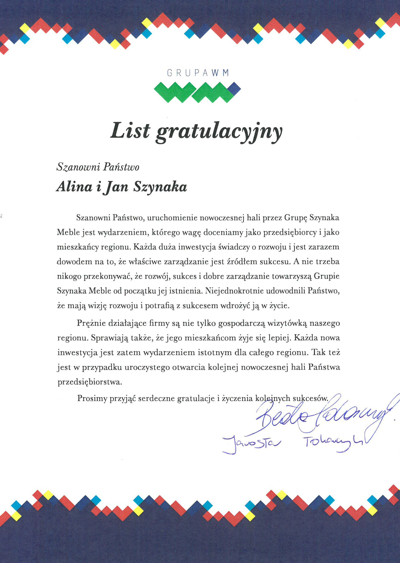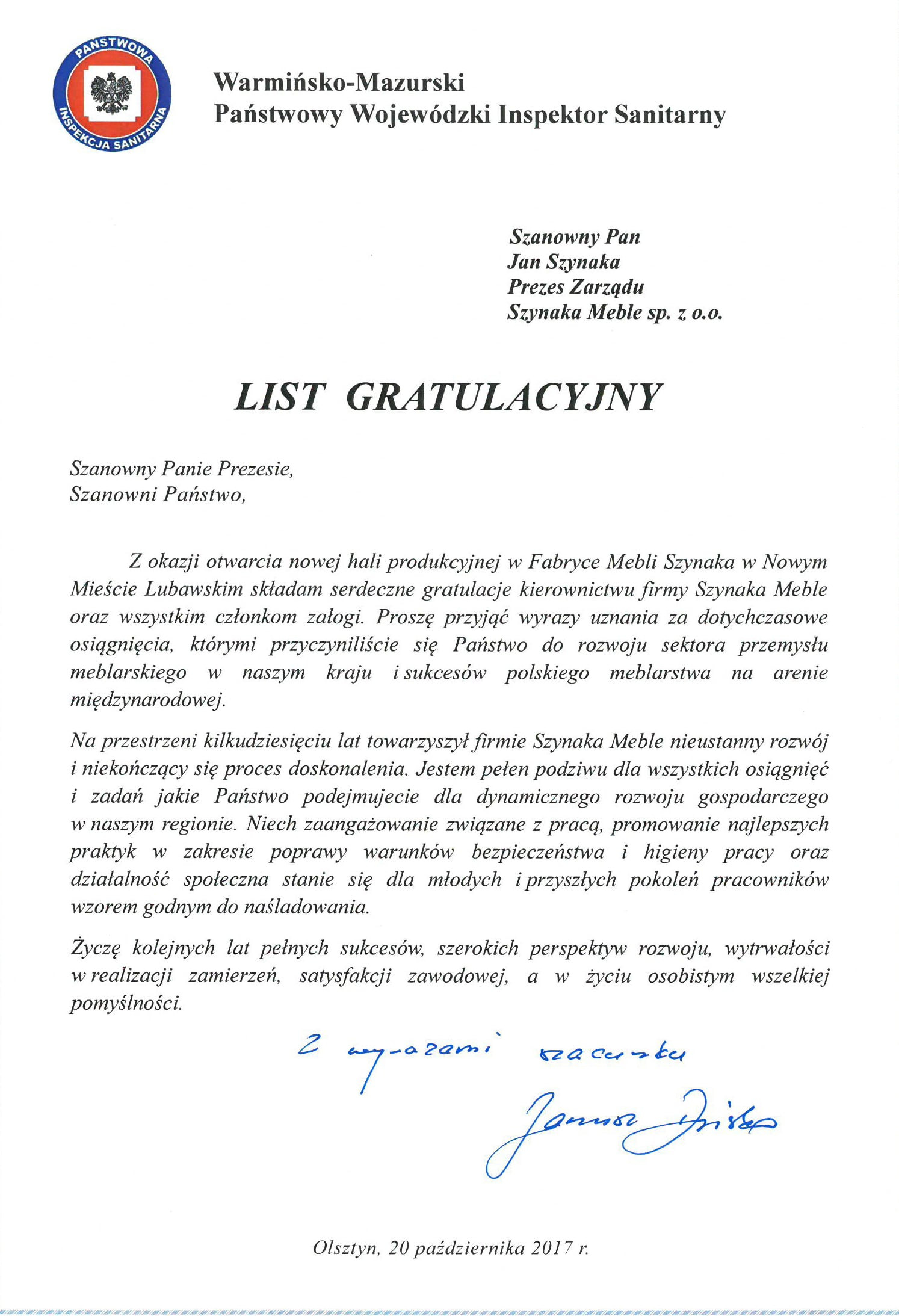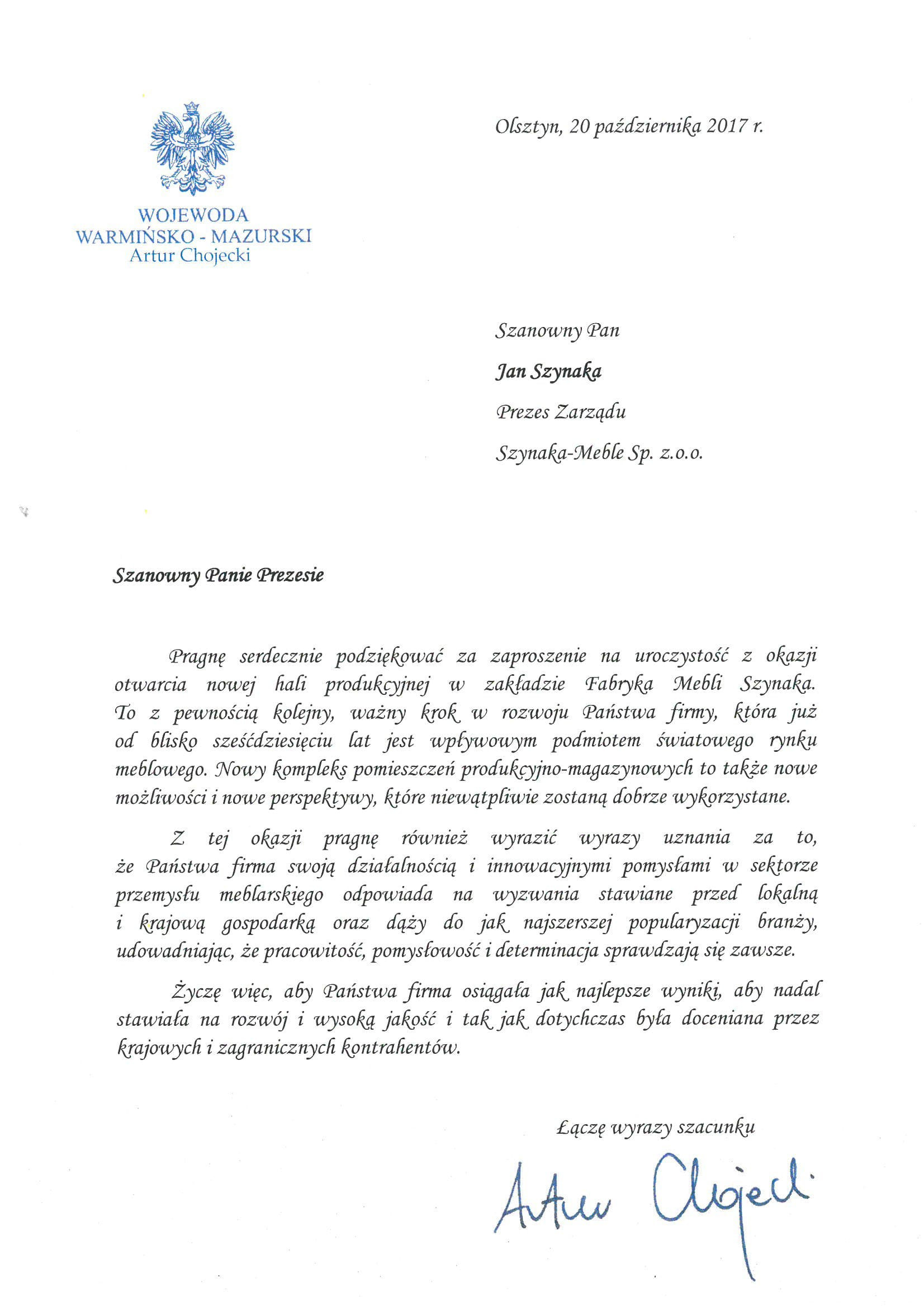 — Pan Jan Szynaka jest człowiekiem niezwykle dynamicznym. Obecnie zatrudnia w swoich fabrykach prawie 3,5 tysiąca osób. Powiem, że jest to spełniony amerykański sen na polskiej ziemi. W czasie 20-letniej historii Warmińsko Mazurskiej Strefy Ekonomicznej, tej firmie wydaliśmy 4 zezwolenia, z czego dwa w tym roku. Patrzymy w przyszłość i mam nadzieję, że na tym nie poprzestaniemy — powiedział Grzegorz Smoliński, prezes zarządu Warmińsko Mazurskiej Specjalnej Strefy Ekonomicznej. Obecnie Fabryka Mebli Szynaka w Nowym Mieście Lubawskim zatrudnia około tysiąca osób. Prezes Jan Szynaka szacuje, że w związku z oddaniem nowej hali zatrudnienie wzrośnie o kolejne kilkadziesiąt osób. Oddana hala, to jednak nie koniec inwestycji w nowomiejskie fabryki Grupy Szynaka. W przyszłym roku w zakładzie MM Szynaka Interline Sp. z o.o. powstanie kolejna hala produkcyjna o powierzchni 13 tysięcy metrów kwadratowych i jak twierdzi prezes Szynaka, będzie wyposażona w bardzo nowoczesny park maszynowy. Wśród zaproszonych gości znalazł się Artur Chojecki, wojewoda warmińsko mazurski, który zaznaczył, że Grupa Meblowa Szynaka kroczy od sukcesu do sukcesu, a ta fabryka to wielki kolejne posunięcie, by otwierać się na dalsze wyzwania rozwojowe i biznesowe.