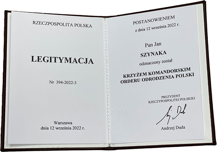 - To dla mnie wielka radość, honor i zaszczyt, że w tak ważnym dla naszego kraju dniu, mogłem otrzymać to prestiżowe odznaczenie. W wyjątkowym roku jubileuszowym naszej firmy, otrzymany Medal jest swoistym uhonorowaniem 65 lat działalności, osiągnięć i sukcesów Grupy Meblowej Szynaka, dzięki którym budujemy siłę naszych firm, polskiej gospodarki i całego kraju na arenie międzynarodowej. Jestem dumny, że dziś nie tylko w Europie ale także na całym świecie meble Szynaka są rozpoznawalne i kojarzone z naszym krajem. Dzięki konsekwentnie realizowanej strategii rozwoju staliśmy się globalną marką. Wysoka jakość naszych mebli, innowacyjne i unikatowe rozwiązania technologiczne stosowane w każdym zakładzie, w połączeniu z niepowtarzalnym designem powodują, że polska firma rodzinna Szynaka Meble jest dziś znana na całym świecie. Wysiłek, który od tylu lat wkładamy w tworzenie naszych mebli, to dziś praca ponad 3 000 wykwalifikowanych pracowników, którzy wspólnie ze mną budują pozytywny wizerunek naszego przedsiębiorstwa, narodowej tożsamości, ale także szeroko rozumianego polskiego biznesu na arenie międzynarodowej. Krzyż Komandorski Orderu Odrodzenia Polski to także ukłon w stronę mojej rodziny, przyjaciół, partnerów biznesowych, a przede wszystkim pracowników, z którymi każdego dnia budujemy siłę polskiego meblarstwa w kraju i na świecie. Wszystkim za to serdecznie dziękuję – powiedział Prezes Jan Szynaka.