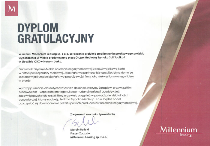 Zaaranżowana przestrzeń stanie się nowoczesnym ale też funkcjonalnym i niezwykle komfortowym miejscem dialogu i spotkań dla najważniejszych przedstawicieli międzynarodowej polityki. Przedsięwzięcie to w znacznym stopniu podkreśli historię i znaczenie polskiej działalności na szczeblu globalnym. Zaaranżowana siedziba będzie z pewnością przez kolejne dziesięciolecia doskonałą formą promocji Polski, polskiej branży meblowej i polskich produktów na arenie międzynarodowej. Meble sygnowane naszym logo od wielu lat promują polskie meblarstwo na arenie międzynarodowej. Cieszymy się, że po raz kolejny sprostaliśmy tak odpowiedzialnemu wyzwaniu, stając się tym samym prekursorem polskości i wizytówką polskiej myśli technologicznej i naszej gospodarki. Od wielu lat firma Szynaka Meble jest wiodącym eksporterem mebli, lokującym prawie 60% sprzedaży poza granicami naszego kraju. Eksportujemy z powodzeniem nie tylko swoje wysokiej jakości produkty ale przede wszystkim jesteśmy kreatorem nowoczesnego, światowego designu i nowoczesnej myśli technologicznej. Jako największa Grupa Meblowa w Polsce jesteśmy dumni, że naszym działaniem możemy wpisać się w piękną historię siedziby ONZ, będącej synonimem dialogu, pokoju, bezpieczeństwa i współpracy międzynarodowej. Oficjalnego otwarcia Sali Spotkań dokonał Pan Prezydent RP Andrzej Duda podczas Zgromadzenia Ogólnego ONZ we wrześniu 2019 r. przy udziale szerokiego grona honorowych gości, w tym przedstawicieli polskiego rządu i ambasady.