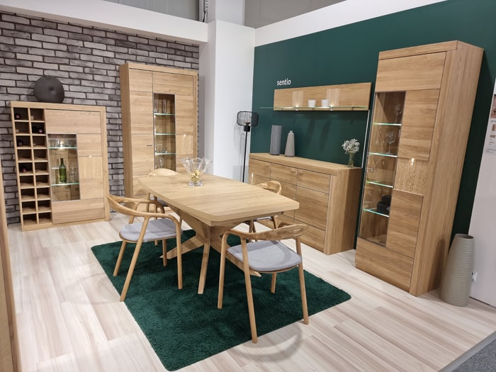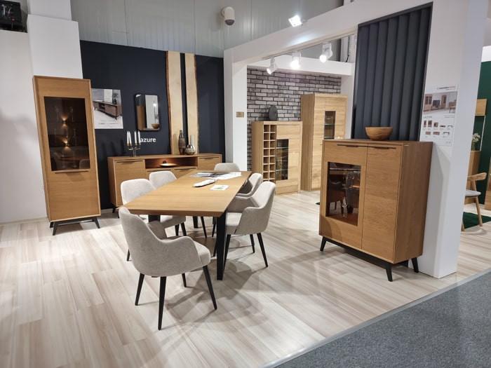 Zmodernizowane centrum wystawiennicze o powierzchni ponad 1500 m² zostało podzielone na różne tematyczne strefy, co umożliwiło efektywną prezentację szerokiej gamy mebli odzwierciedlających różnorodne możliwości produkcyjne ośmiu nowoczesnych zakładów Grupy Meblowej Szynaka. Dzięki temu rozwiązaniu klienci mogli łatwo znaleźć produkty dostosowane do ich potrzeb rynkowych oraz preferencji zakupowych. Firma Szynaka Meble zaprezentowała na targach imponujący asortyment ponad 500 różnorodnych modeli mebli, w tym ponad 30 kolekcji mebli łazienkowych oraz szeroki wybór mebli kuchennych, biurowych, sypialnianych, komód, stołów, stolików oraz mebli tapicerowanych. Szczególnym zainteresowaniem klientów cieszyła się strefa mebli drewnianych PrestigeLine, charakteryzujących się elegancją, nowoczesnym designem oraz wysoką jakością wykonania. Szybka dostępność prezentowanych na targach mebli zachęcała klientów do składania zamówień i tym samym wdrażania nowoczesnych i designerskich rozwiązań do swoich salonów meblowych.