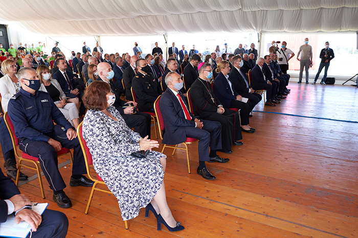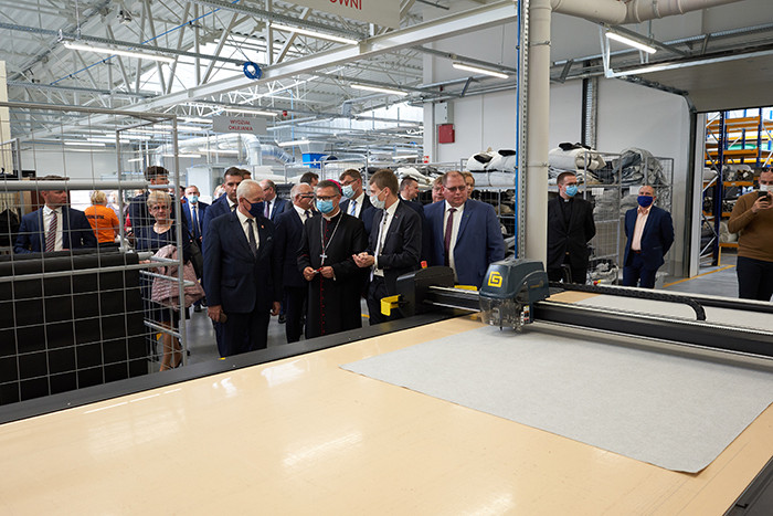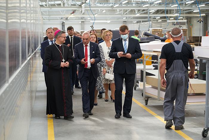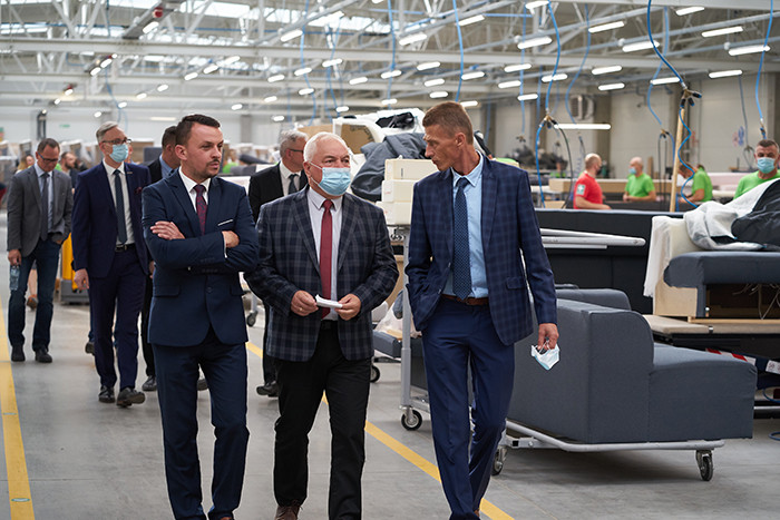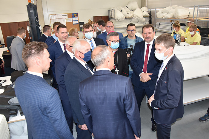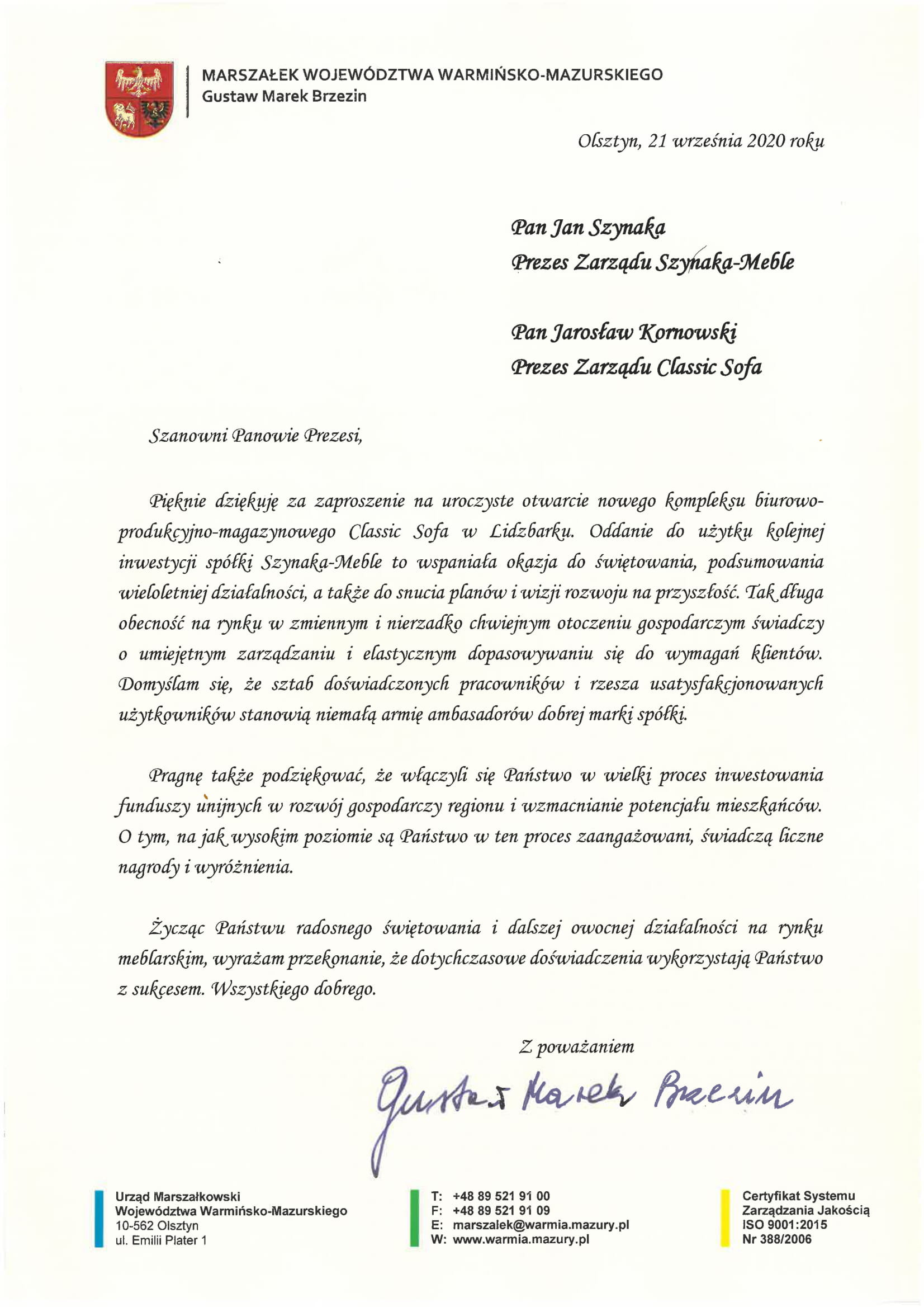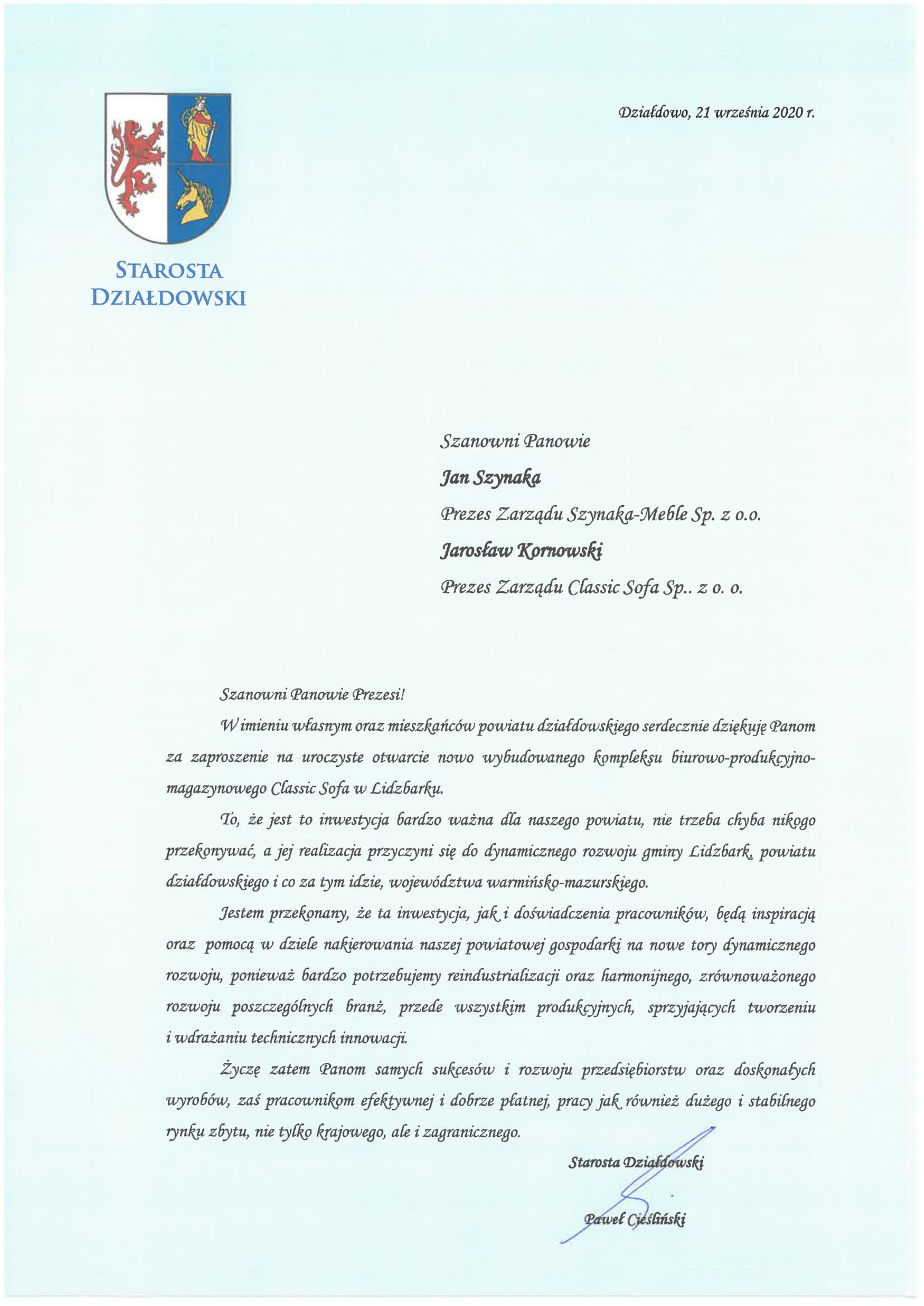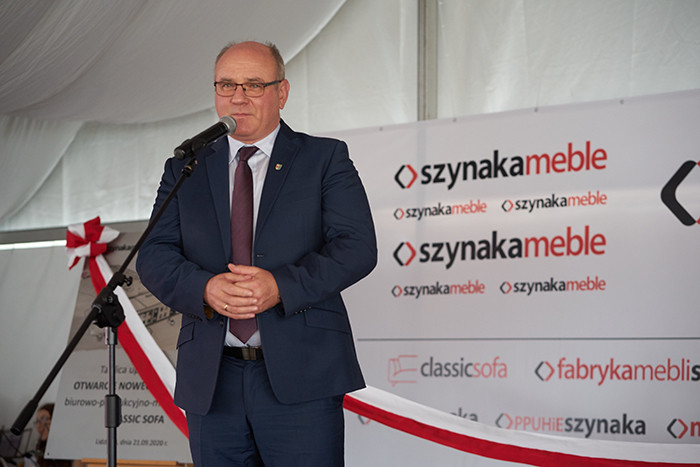 Uroczystą część spotkania rozpoczęło powitanie przybyłych gości przez Prezesa Classic Sofa Pan Jarosława Kornowskiego, który zaprezentował film z etapów budowy fabryki. Następnie głos zabrali Państwo Prezes Alina i Jan Szynaka, którzy dziękując za wkład i profesjonalizm włożone w budowę nowego zakładu, wręczyli wykonawcom pamiątkowe listy gratulacyjne. Następnie krótkim przemówieniem, gratulacjami i ciepłymi słowami uznania, że w tak trudnym czasie epidemii udało się firmie zrealizować tak znakomitą inwestycję, swoją obecność zainicjowali: Podsekretarz Stanu Ministerstwa Rozwoju Pani Olga Semeniuk, Poseł na Sejm RP Pan Zbigniew Ziejewski, Wojewoda Warmińsko Mazurski Pan Artur Chojecki, Marszałek Województwa Warmińsko-Mazurskiego Pan Gustaw Marek Brzezin, Prezes Warmińsko Mazurskiej Specjalnej Strefy Ekonomicznej Pan Zbigniew Targowski, Starosta Powiatu Działdowskiego Pan Paweł Cieśliński oraz Burmistrz Lidzbarka Pan Maciej Sitarek.