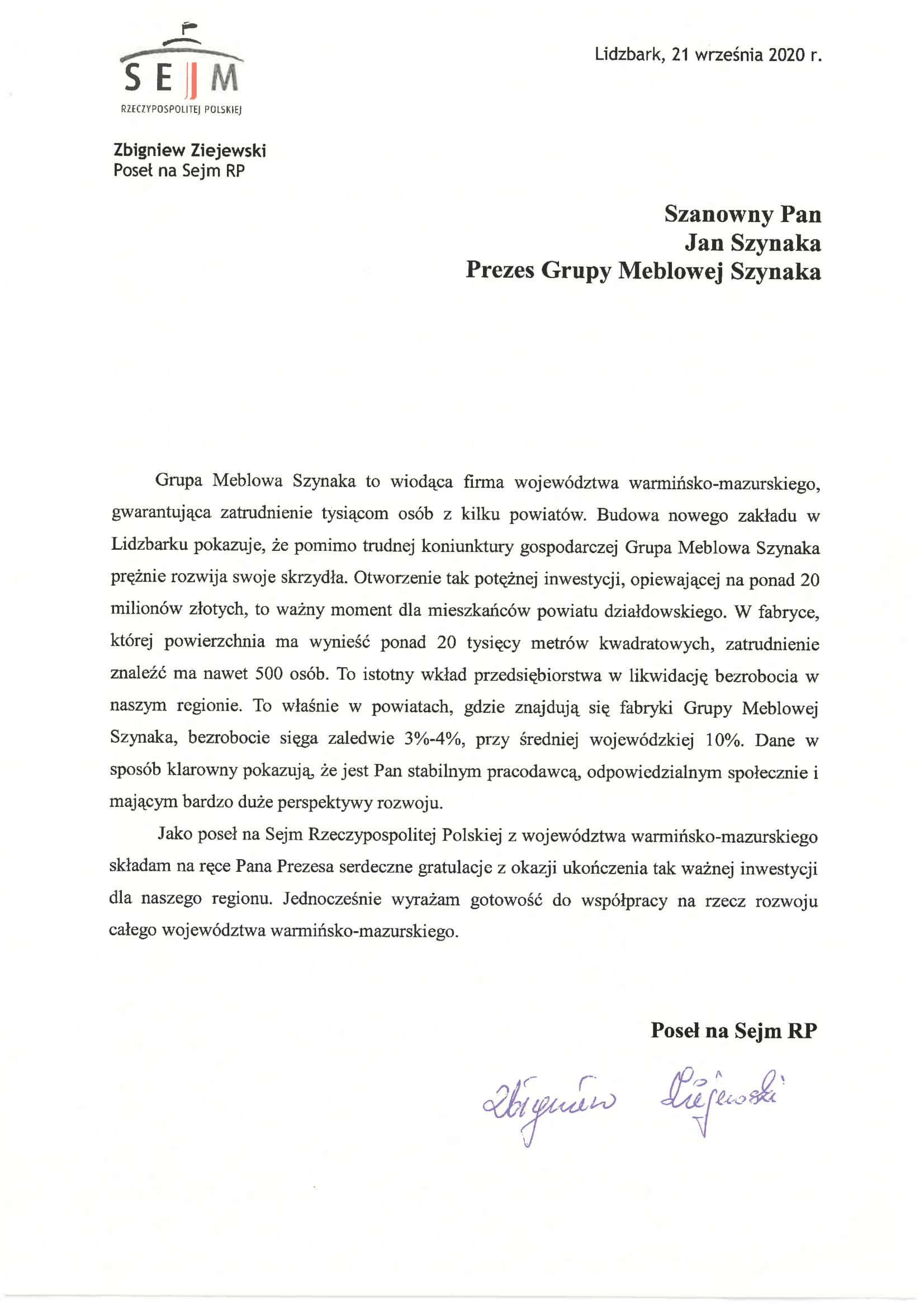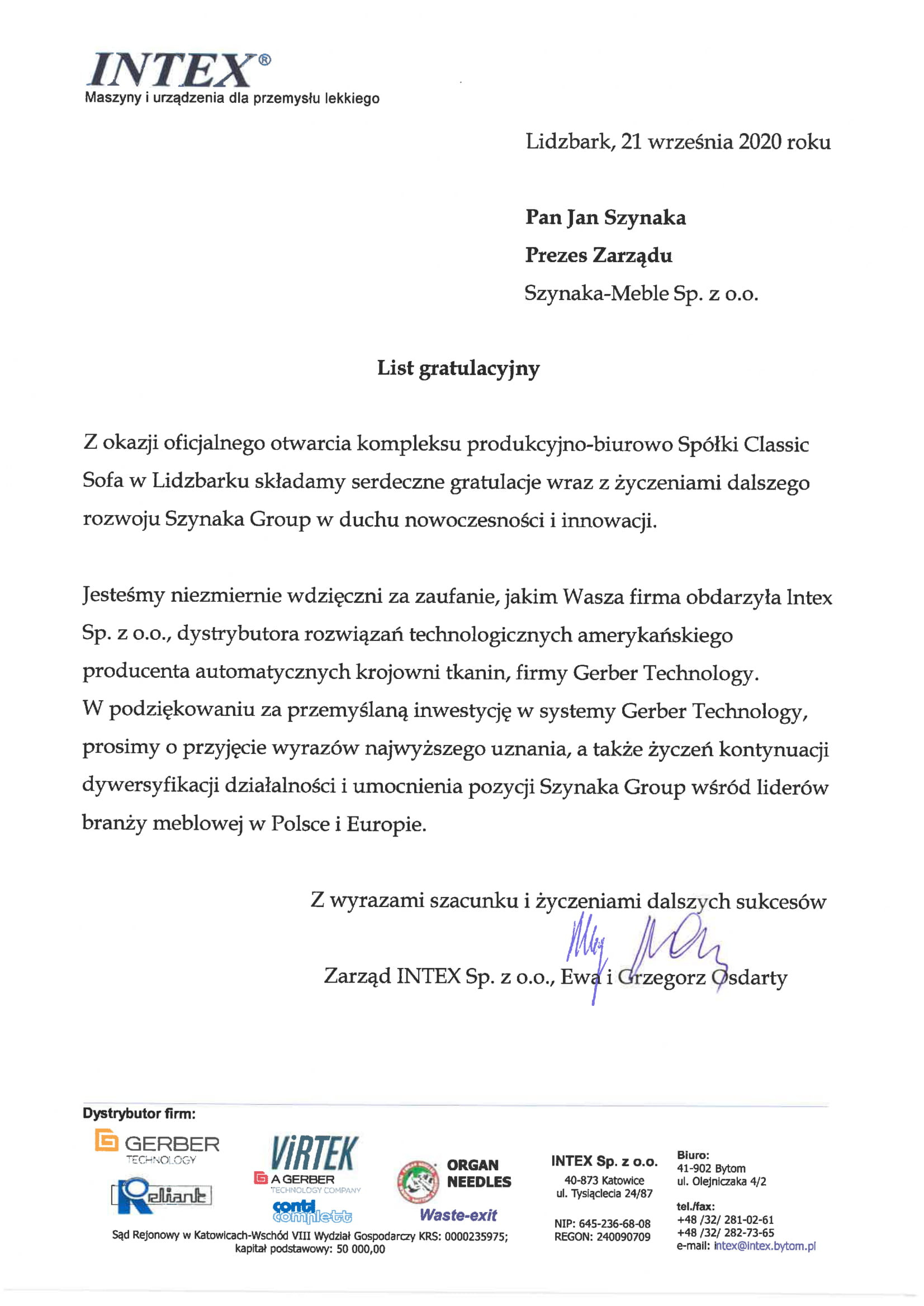Właściciele Alina i Jan Szynaka składają wszystkim gościom serdeczne podziękowanie za tak liczne przybycie. Ranga uroczystości oraz obecność przedstawicieli władz Państwowych, Wojewódzkich i Samorządowych dowodzi jak znaczącym i liczącym się na krajowym i światowym rynku producentem mebli i partnerem biznesowym jest Grupa Meblowa Szynaka.