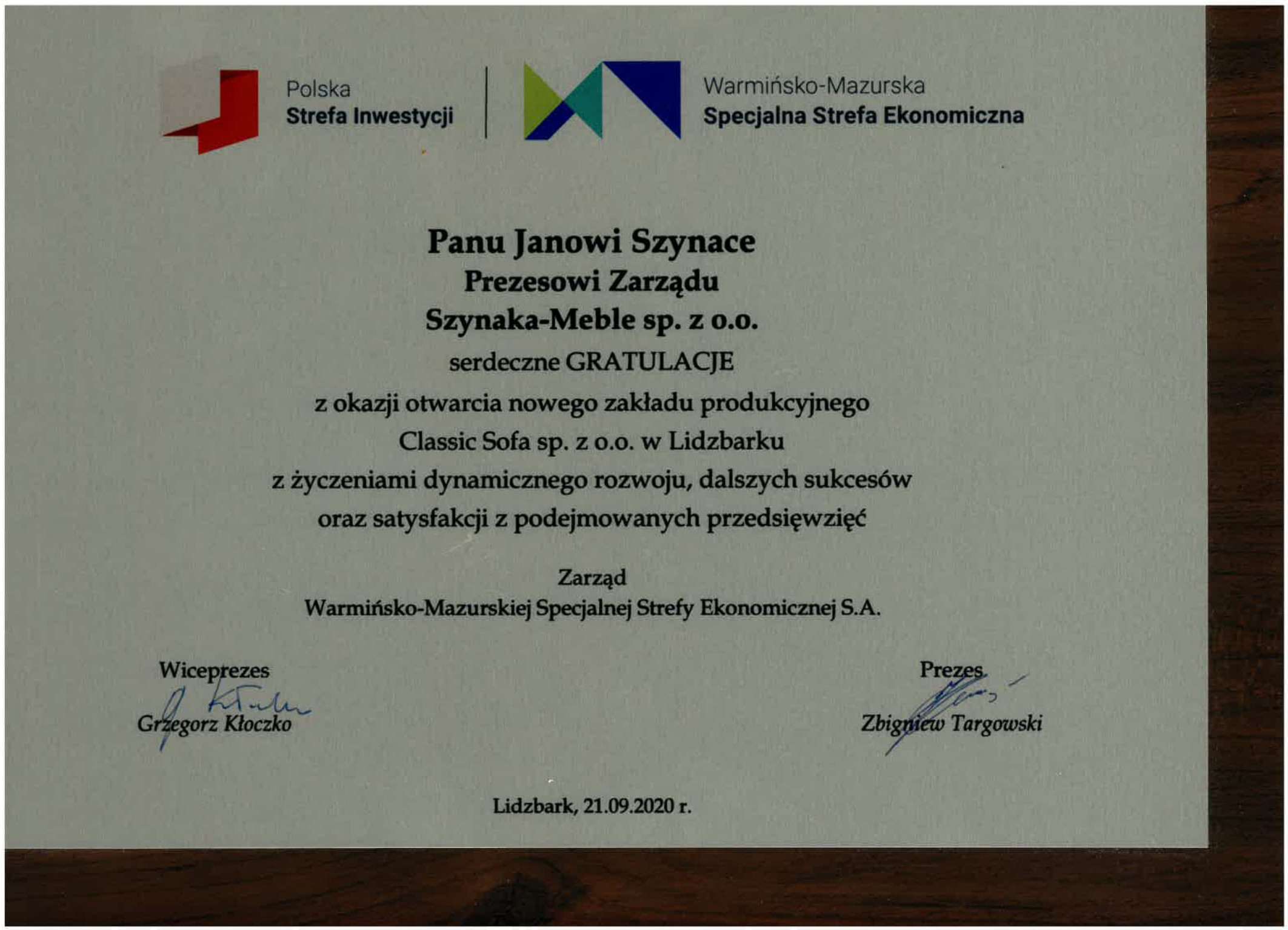 Firma Classic Sofa jest pierwszym zakładem w Grupie Meblowej Szynaka specjalizującym się w produkcji mebli tapicerowanych. Nowoczesny park maszynowy, konsekwentnie realizowana strategia rozwoju oraz kapitał ludzki firmy pozwalają optymistycznie patrzeć na powodzenie zrealizowanej za prawie 19 mln zł inwestycji. Zastosowanie nowoczesnych rozwiązań technologicznych i wzorniczych pozwoli oferować na polskim i światowym rynku meblowym najwyższą jakość produkowanych mebli tapicerowanych. Zrealizowana inwestycja jest bardzo ważna nie tylko dla rozwoju Grupy Meblowej Szynaka, Lidzbarka ale przede wszystkim to znaczące wydarzenie dla rozwoju regionu jak i kraju. W nowo wybudowanej firmie zatrudnienie znalazło prawie 200 osób, co ma niezwykle pozytywny wpływ na lokalny rynek pracy. Inwestycja ta jest pierwszym etapem budowy fabryki Classic Sofa, docelowo jej łączna powierzchnia będzie wynosiła ponad 20 tys. m2, a pracę w niej znajdzie nawet 500 osób. Inwestycja została zrealizowana na terenie Warmińsko-Mazurskiej Specjalnej Strefy Ekonomicznej.